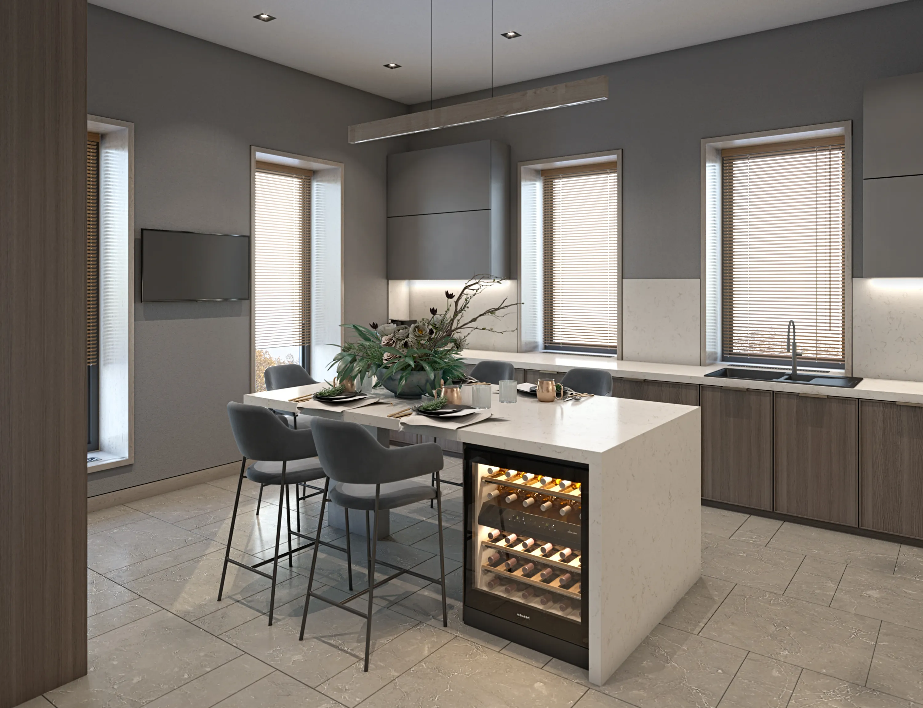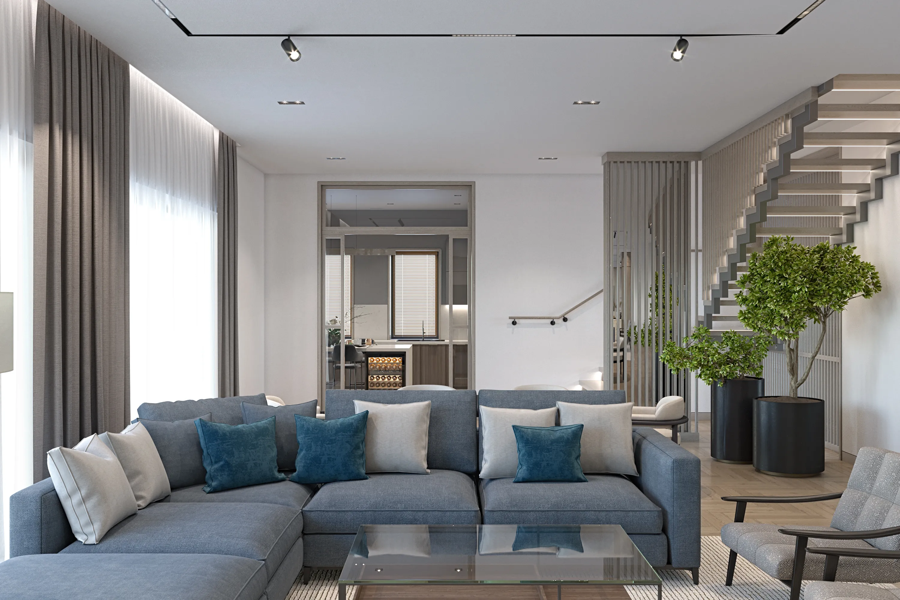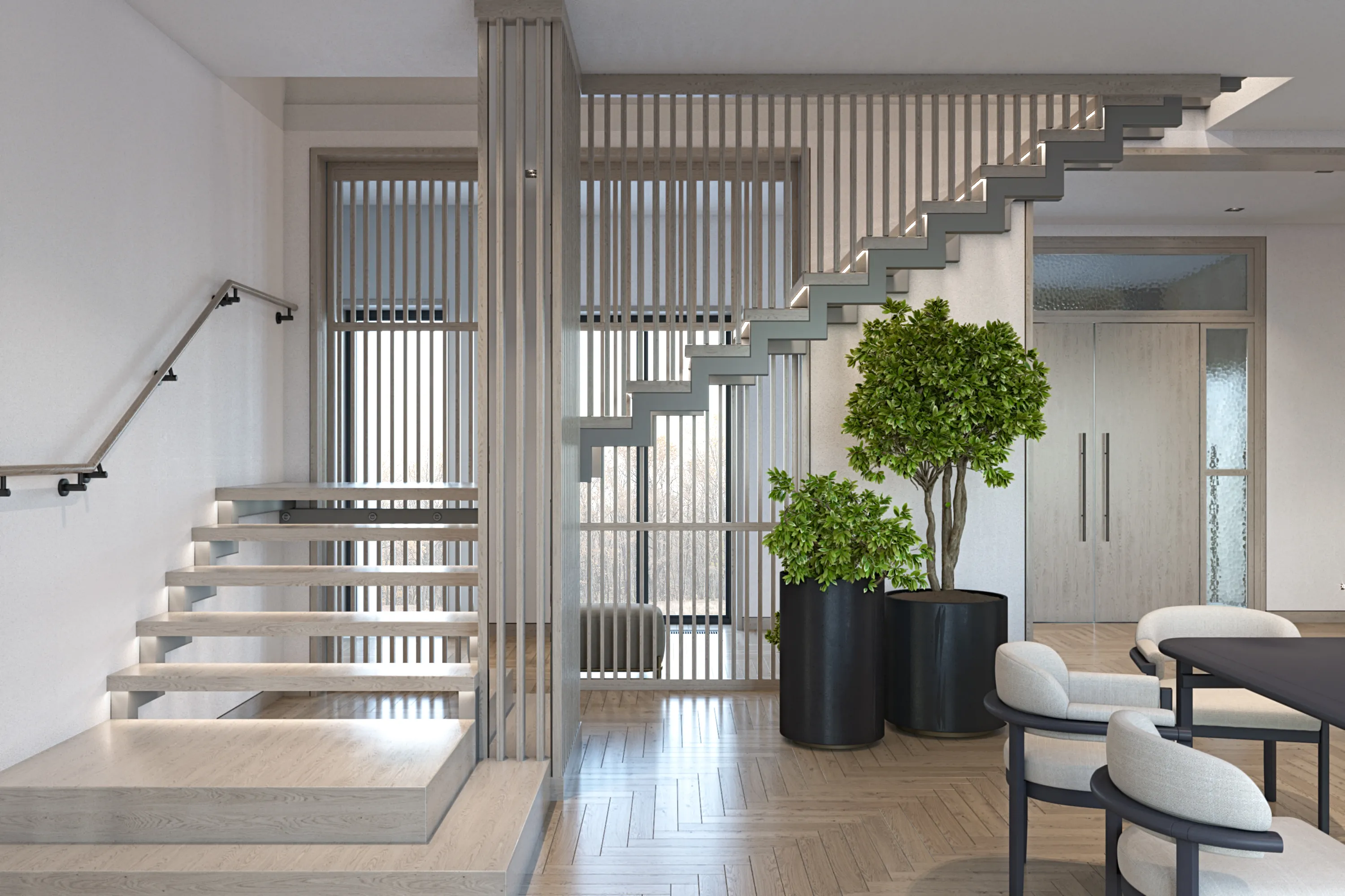 This modern home seamlessly merges Scandinavian coziness with Japanese simplicity, creating a serene Japandi haven for a family of five. Warm wood tones dominate the interior, enhancing the minimalist aesthetic while adding natural texture and depth. Clean lines, understated décor, and functional design solutions ensure each space remains both welcoming and practical, perfectly embodying the balance of this distinctive style.